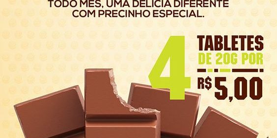 O flyer da Brasil Cacau se destaca com a fonte, atraindo bastante a atenção para a ideia do preço baixo. E também é claro, pelo apelo criado pela imagem do chocolate, paixão nacional.