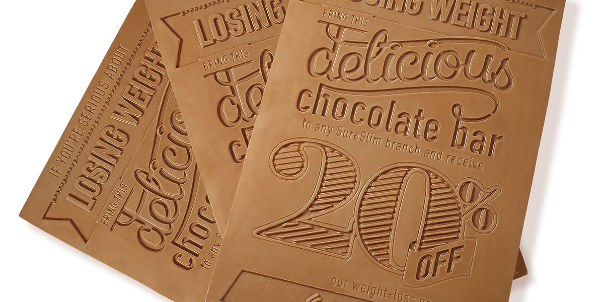 A SureSlim auxilia pessoas na perda de peso e precisava de algo criativo que incentivasse as pessoas a irem até eles. Pois bem. Distribuíram um flyer de chocolate e junto dele um de papel que dizia: “Se você está levando a sério a ideia de perder peso, traga essa deliciosa barra de chocolate para qualquer unidade SureSlim e receba 20% de desconto em nosso programa de redução de peso“.
